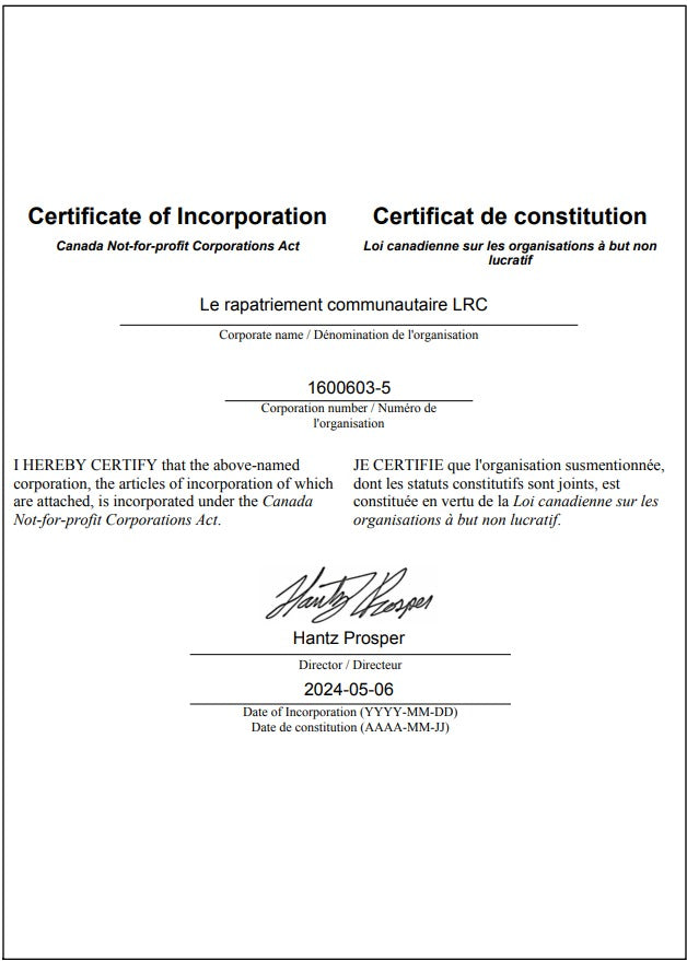 LRC est une association Internationale constitué en vertu de la loi canadienne sur les associations à but non lucratif.